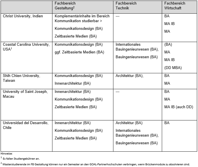 Wer kein GOAL-Stipendium erhält, aber trotzdem an einer der genannten Partnerhochschulen studieren möchte, kann sich über das reguläre Bewerbungsverfahren des Fachbereichs um einen Studienplatz bewerben. Eine neue Bewerbung ist in diesem Fall erforderlich. Die Anforderungen und Fristen deines Fachbereichs sind dabei zu beachten.