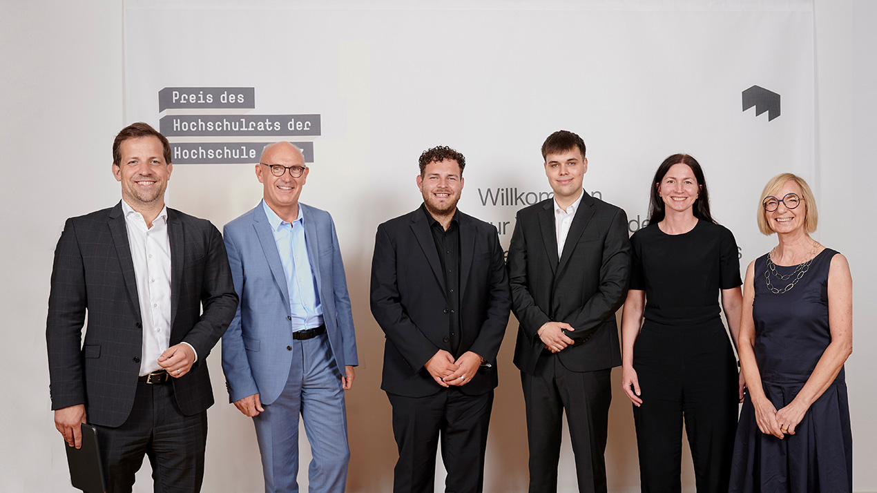 Verleihung des Preises des Hochschulrats 2023 (v. l.: Uwe Abel, Vorsitzender des Hochschulrats der Hochschule Mainz, Preisträgerin Ina Weimer, Preisträger Torben Hammerle, Preisträger Fabian Naethbohm und Prof. Dr. Susanne Weissman, Präsidentin der Hochschule Mainz); Copyright: Nathalie Zimmermann