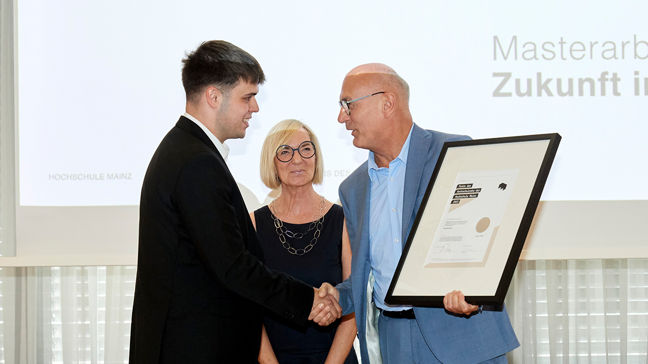 Prof. Dr. Susanne Weissman, Präsidentin der Hochschule Mainz, und Uwe Abel, Vorsitzender des Hochschulrats der Hochschule Mainz, überreichten Torben Hammerle, Absolvent des Studiengangs Architektur, den mit 5000 Euro dotierten 1. Preis für seine Masterarbeit „Zukunft im LandLeben“. (Foto: Nathalie Zimmermann)
