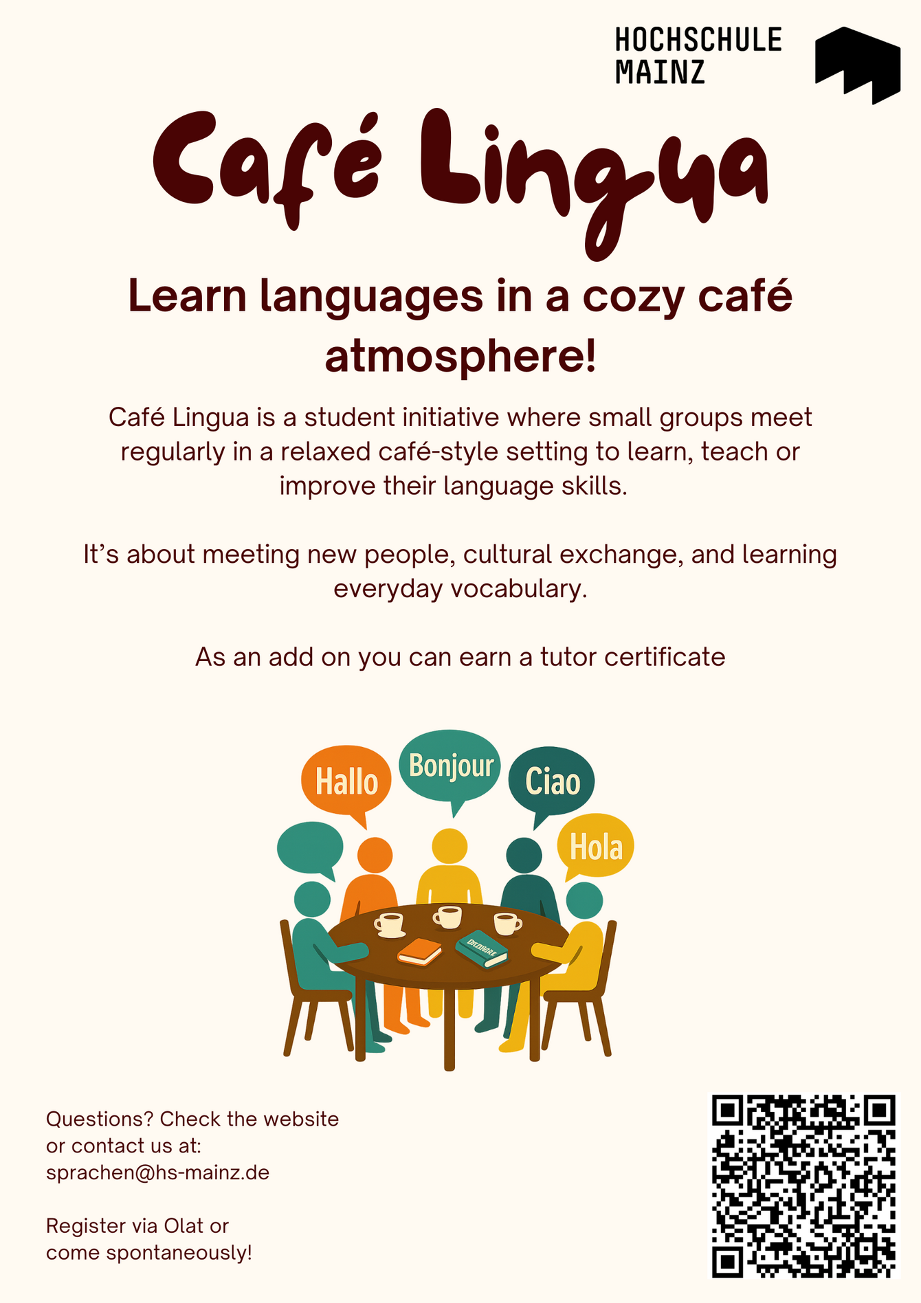 à Send an e-mail to sprachen (at) hs-mainz.de and let us know which language you’d like to learn, teach – or which culture you’d like to explore.