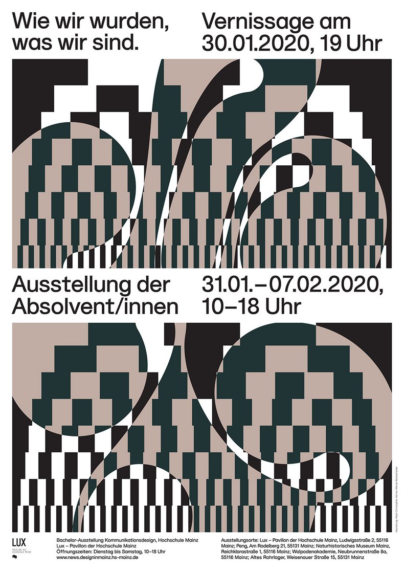 Dort werden neben den Arbeiten der Absolvent*innen zusätzliche Events stattfinden. Vernissage: 30.01.2020, 19 Uhr Ausstellungsdauer: 31.01. – 07.02.2020 Öffnungszeiten der Ausstellung: 10 bis 18 Uhr Ort: LUX, Pavillon der Hochschule Mainz, Ludwigstaße 2, 55116 Mainz