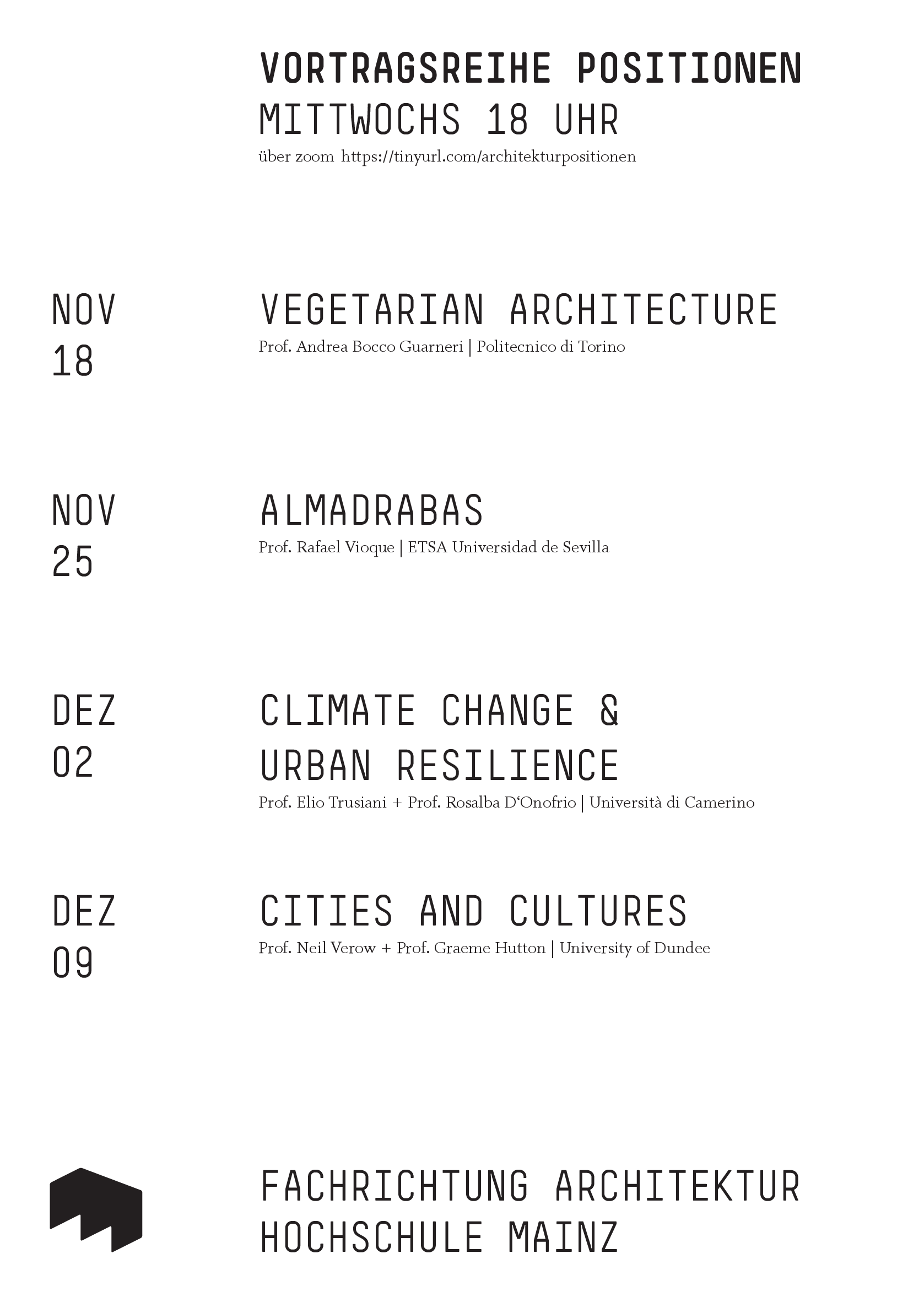 Im Rahmen der Vortragsreihe Positionen der Fachrichtung Architektur sind im Wintersemester 2020|21 Vertreterinnen und Vertreter einiger Partnerhochschulen geladen. Diese internationale Reihe hält verschiedenste Themen vor.