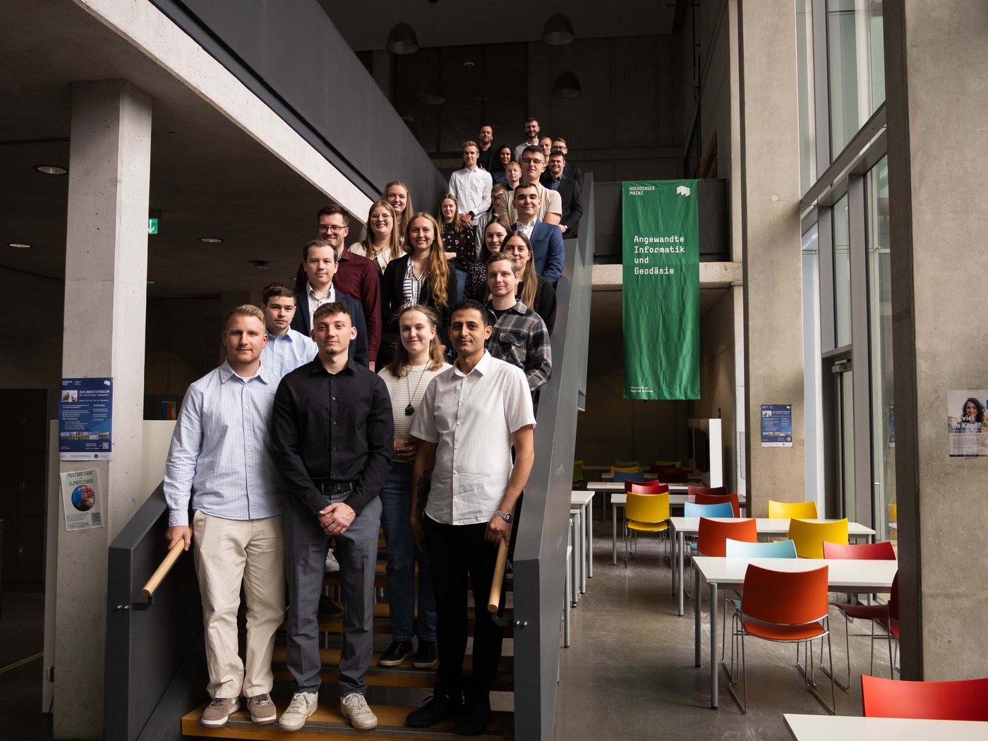Am 25. Oktober 2025 feierte die Fachrichtung Angewandte Informatik und Geodäsie der Hochschule Mainz ihre Absolvent:innen: In der Aula der Hochschule verabschiedete sie sich in festlichem Rahmen von 50 Bachelor- und Masterabsolvent:innen der Studiengänge Geoinformatik und Vermessung (BA und MA) sowie Geoinformatik (M.Eng.). Viele der Absolvent:innen nahmen gemeinsam mit Familie und Freunden an der Feier teil.