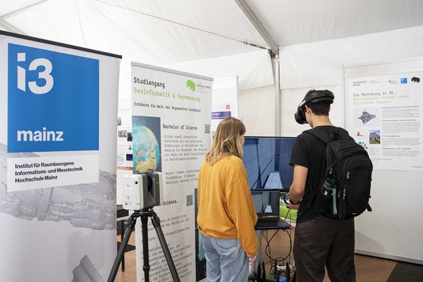 Am Samstag und Sonntag gaben Mitarbeitende des img mit der Mobile Projection Unit dann allen Interessierten die Möglichkeit hierzu. Die WIMA Besucherinnen und Besucher konnten dabei selbst ausprobieren, wie Medien entstehen und sich inspirieren lassen eigene kreative Ideen umzusetzen. Das Mainzer Zentrum für Digitalität in den Geistes- und Kulturwissenschaften (mainzed) zeigte am Wochenende, wie Forschungsprojekte anhand von Wikidata standardisiert erfasst und vernetzt werden können. Im Jubiläumsjahr stand dabei besonders die Frage im Fokus, wie wissenschaftlicher Fortschritt durch Kooperation entsteht – und wie Interessierte sich aktiv einbringen können. Mit einem terrestrischen Laserscanner demonstrierten Mitarbeitende des i3mainz die Möglichkeiten des Monitorings mit Profilscannern. Die Technik ermöglicht es, Bauwerke berührungslos, hochfrequent und präzise auf Verformungen zu untersuchen – ein wichtiger Beitrag für die Sicherheit von Brücken und Infrastruktur. Ein weiteres Highlight am Stand des i3mainz war das 3D-Modell der Marksburg bei Braubach: Die Masterarbeit von Sarah Hillen erfasste das gesamte Bauwerk mit Laserscanner und Drohnenfotos. Besucherinnen und Besucher konnten die detailreiche Punktwolke am Rechner und mit einer VR-Brille erkunden. Das Modell dient als Grundlage für Anwendungen in GIS und Building Information Modeling (BIM).