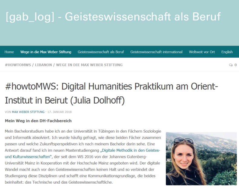Julia Dolhoff gehört zu den ersten Studierenden aus Mainz, die an einem der MWS-Institute ein Digital Humanities-Praktikum absolviert haben. Diese Initiative wollen die MWS und mainzed, das als Verbund von sechs Mainzer Institutionen im Bereich der digital arbeitenden Geistes- und Kulturwissenschaften koordinierend tätig ist, weiterführen und verstetigen, so dass auch in den kommenden Jahren Studierende aus Mainz praktische Erfahrung im Forschungsbereich der Digital Humanities (DH) an den MWS-Instituten sammeln können. Umgekehrt profitieren auch die Institute, wenn Studierende aus dem dynamischen Bereich der DH Impulse vermitteln können.