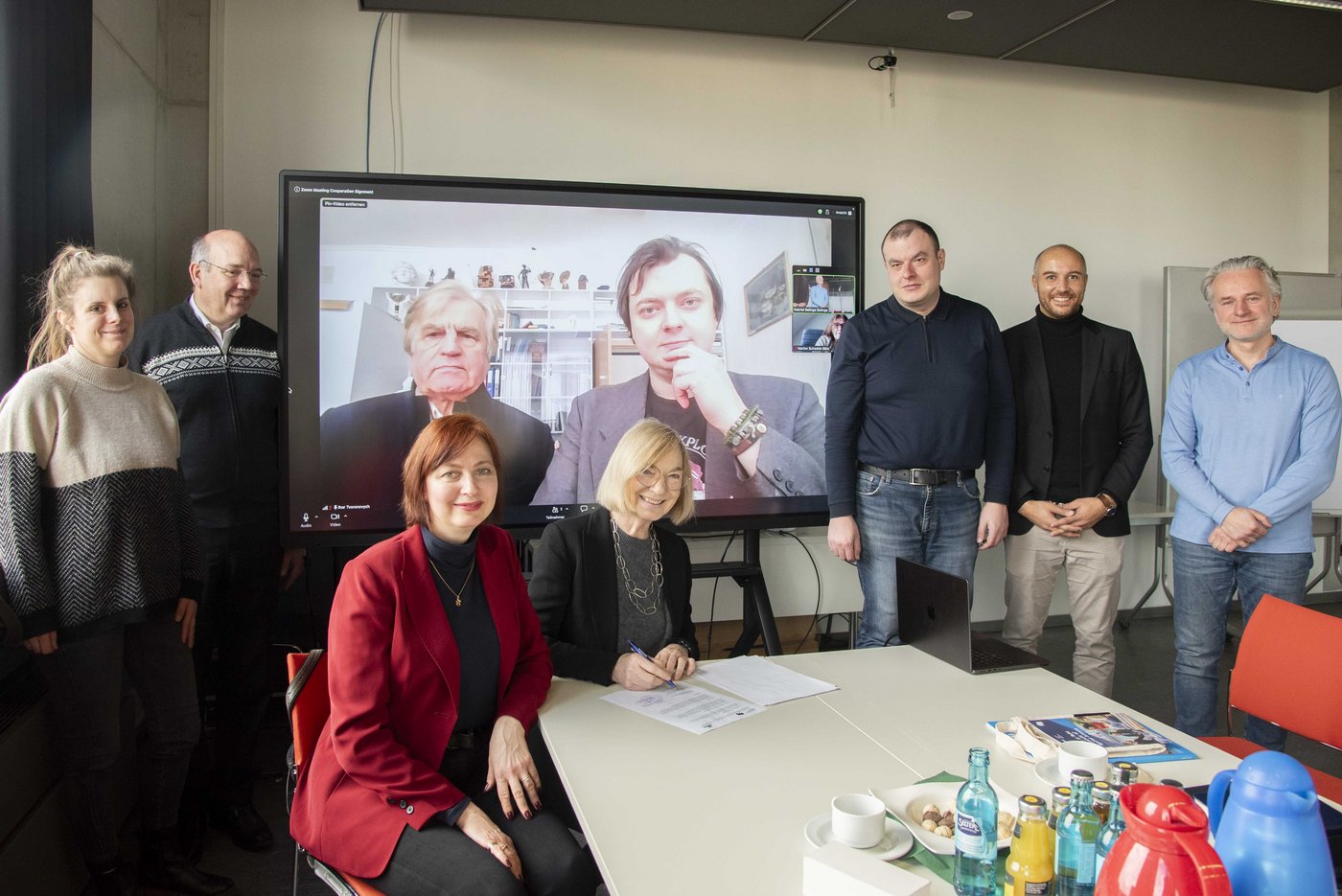Im Rahmen eines Besuchs zweier Hochschulvertretungen aus Kiew wurde das Kooperationsabkommen nun offiziell von der Präsidentin der Hochschule Mainz, Prof. Dr. Susanne Weissman, unterzeichnet. Das Dokument war zuvor bereits von der Hochschulleitung in Kiew unterzeichnet worden. Der Dekan der KNUCA nahm digital an der feierlichen Unterzeichnung teil.