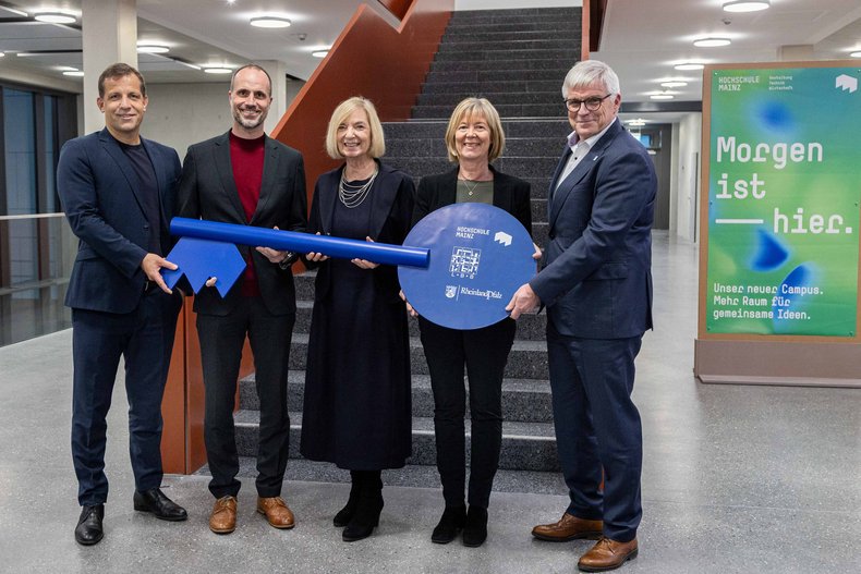Bei einer feierlichen Schlüsselübergabe am 27. Oktober 2025 hat der Landesbetrieb Liegenschafts- und Baubetreuung (Landesbetrieb LBB) den zweiten Bauabschnitt an die Hochschule Mainz übergeben. Beim Festakt sprachen die Präsidentin der Hochschule Mainz Prof. Dr. Susanne Weissman, Finanzministerin Doris Ahnen, Wissenschaftsminister Clemens Hoch, der Oberbürgermeister der Stadt Mainz Nino Haase und Holger Basten, Geschäftsführer des Landesbetriebs LBB, dessen Niederlassung Mainz den Neubau managt. Die Schlüsselübergabe markiert den offiziellen Beginn für den anschließenden Umzugsprozess der Hochschulstandorte aus der Innenstadt.