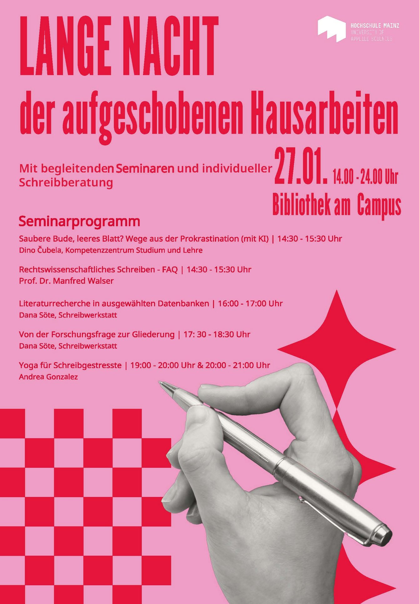 Am Dienstag den 27.01.26 steht Ihnen hierfür die Bibliothek am Campus von Mittags 14:00 Uhr bis Mitternacht mit Schreibberatungen, Workshops und Entspannungsangeboten zur Verfügung, damit Sie konzentriert und mit kompetenter Beratung an Ihren Schreibprojekten arbeiten können.