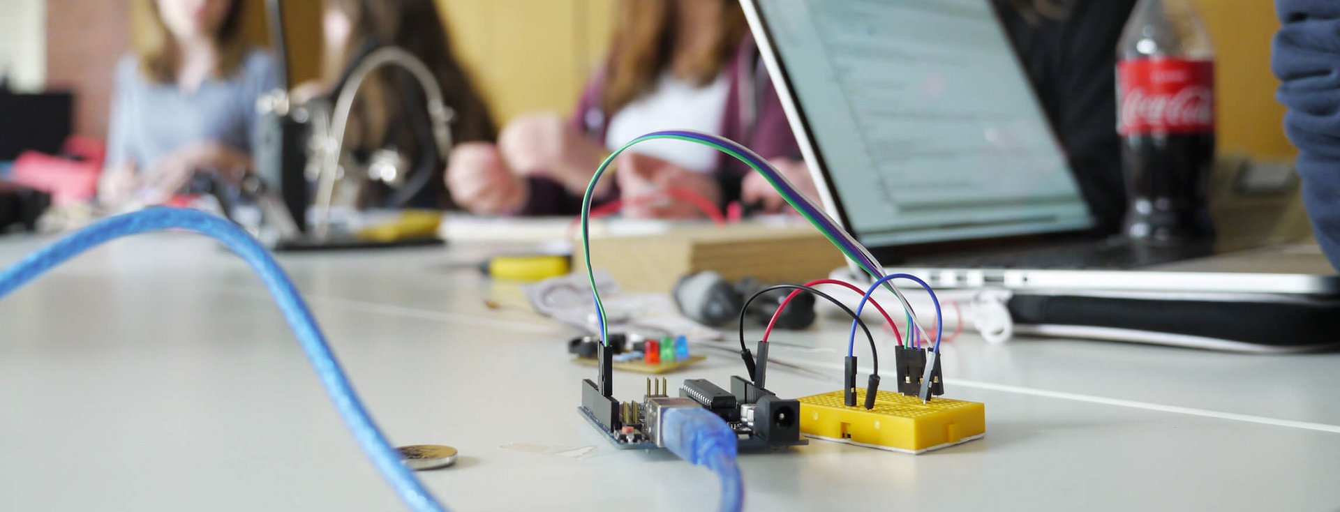 Auch Werkzeuge, wie bspw. Löt-Kolben und Zubehör, zur Vernetzung von Gegenständen und dem Einsatz von Sensoren, sind in der Werkstatt verfügbar.