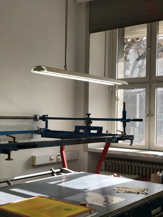 Hier stehen Ihnen eine Einrichtung zur Montage und Belichtung der Drucksiebe sowie diverse Drucktische zur Verfügung. Sie können verschiedene Materialien bis zu einem Format von DIN A0 und räumliche Objekte bis zu einer Stärke von einigen Zentimetern bedrucken.