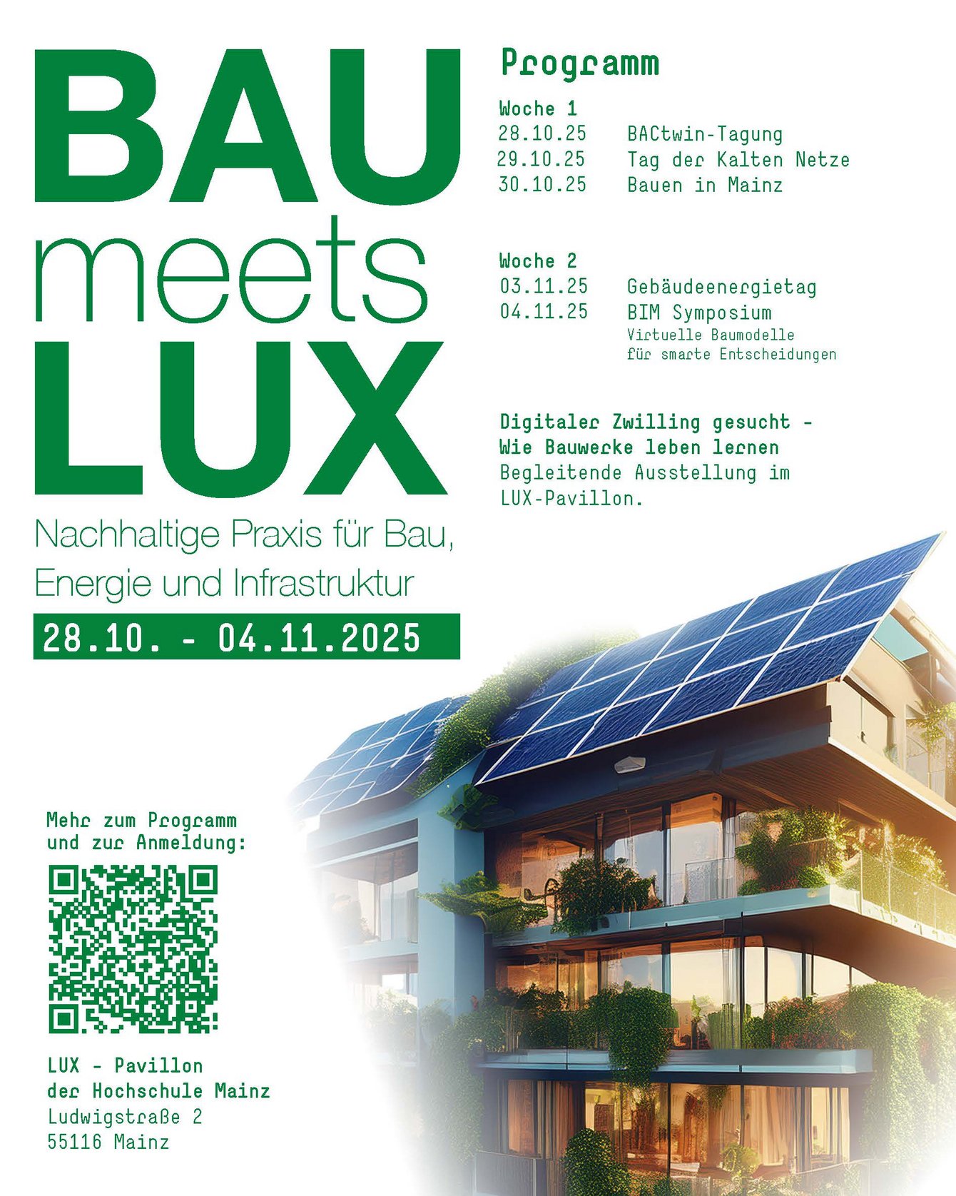 Vom 28. Oktober bis zum 4. November 2025 wird der LUX-Pavillon der Hochschule Mainz erneut zum Treffpunkt für alle, die sich für zukunftsfähige Lösungen in Bau, Energie und Infrastruktur interessieren. BAU meets LUX verbindet Fachveranstaltungen, Forschungseinblicke und Austauschformate – interdisziplinär, praxisnah und mit Blick auf eine nachhaltige gebaute Umwelt.