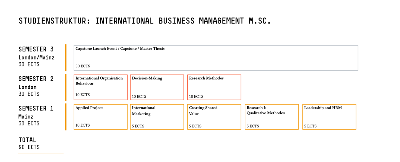 Sie schließen Ihren International Business Management Master mit einem unabhängigen, praxisorientierten Forschungsprojekt ab, das in London (oder alternativ in Mainz) betreut und berufsbegleitend geschrieben werden kann.